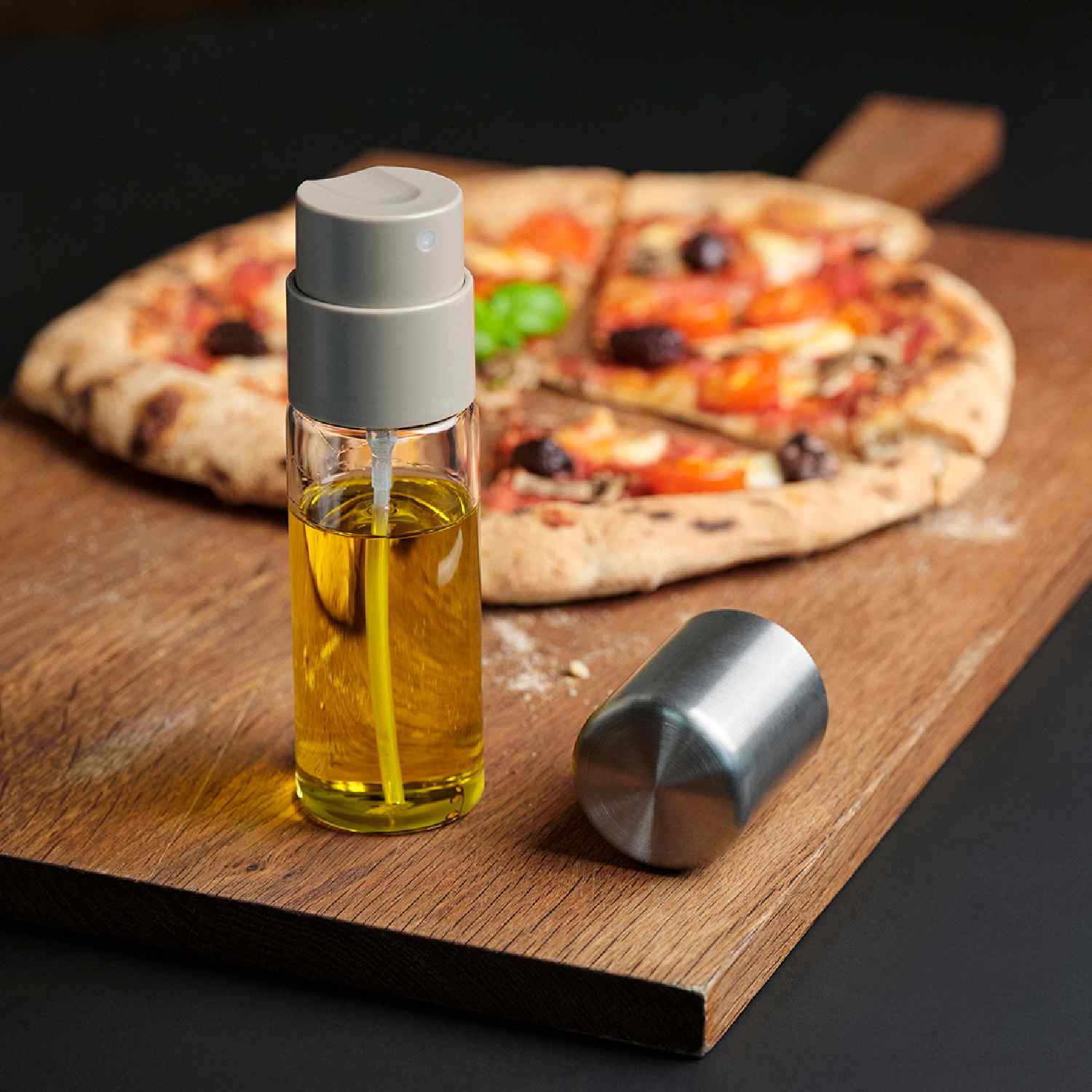 Stiklinis aliejaus purškiklis, kuris tolygiai paskirsto aliejų salotoms, keptuvei ar kepimo formoms. Galite pasigaminti žolelių aliejų su čiobrelio ar rozmarino šakele – gražu ir praktiška.