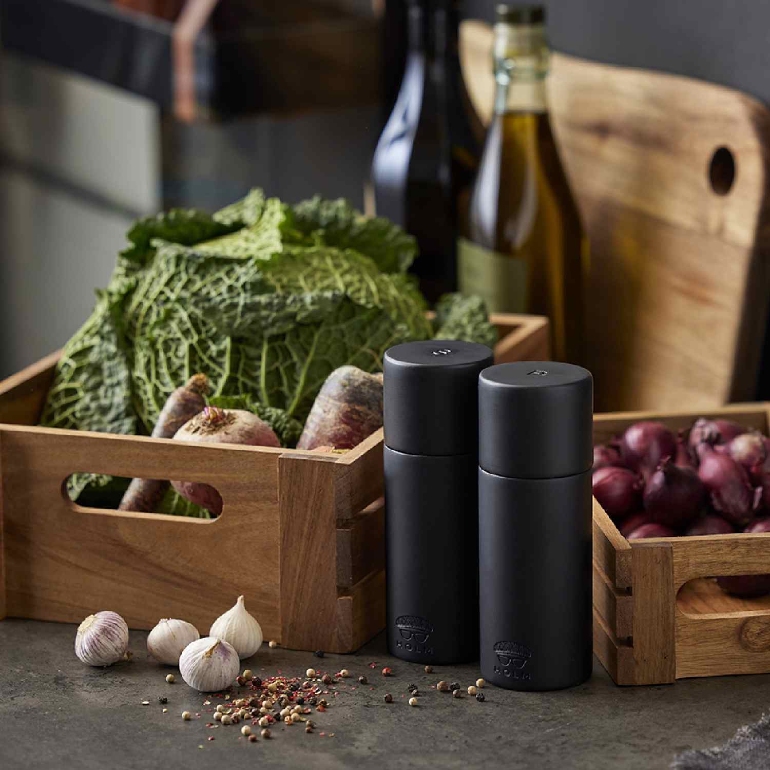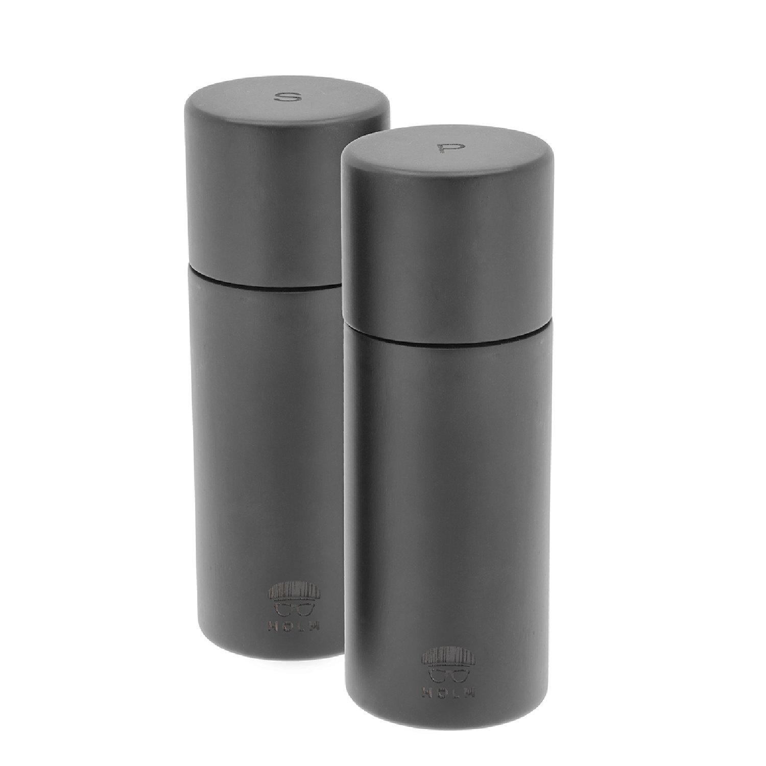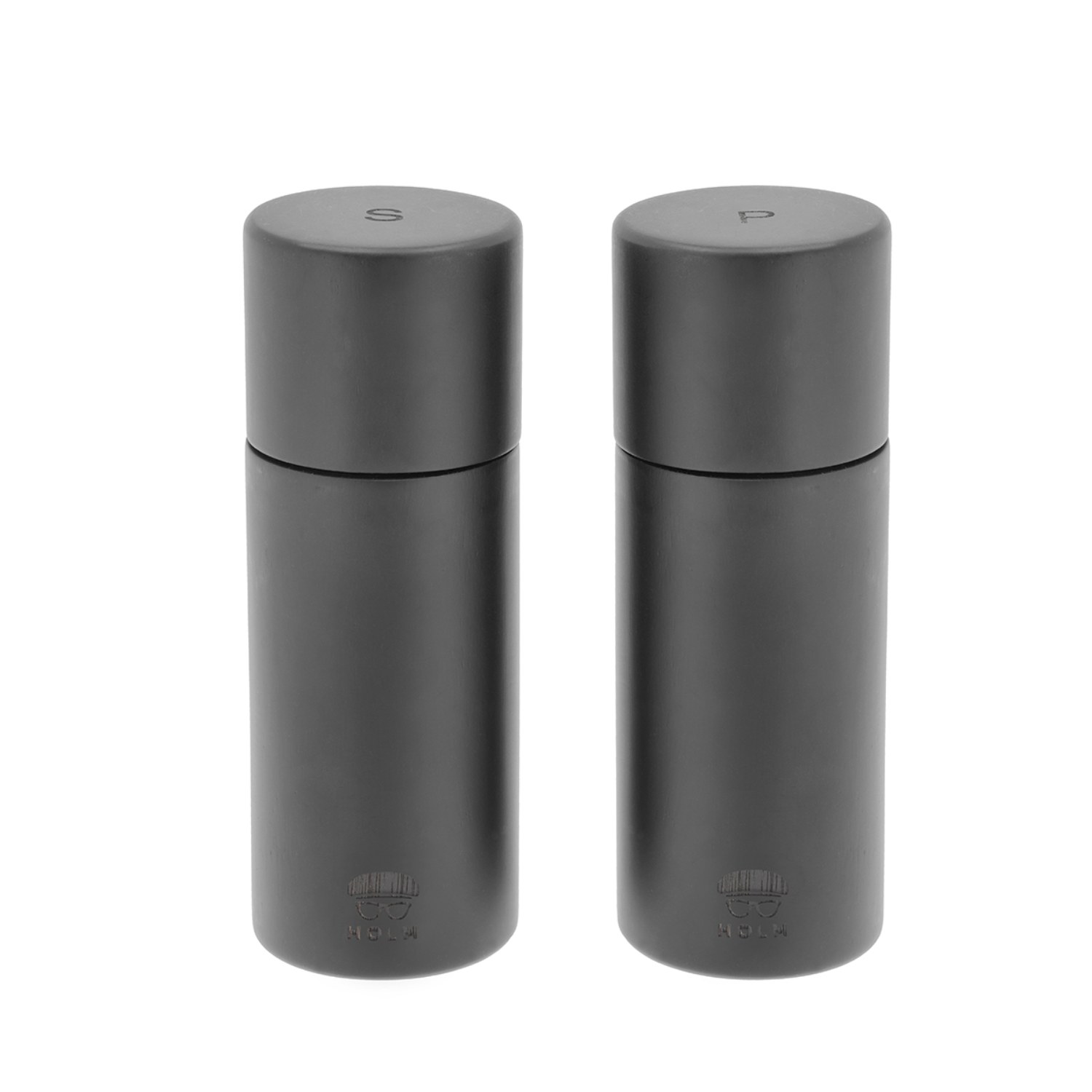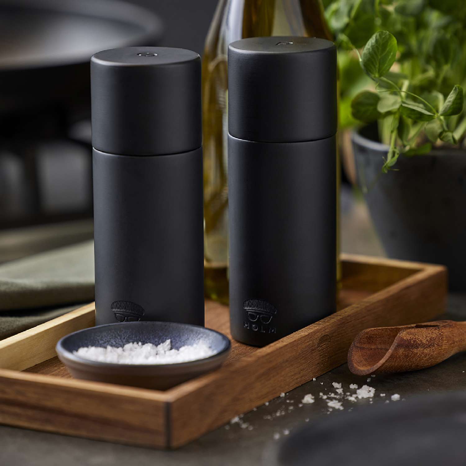 Druskos ir pipirų malūnėliai HOLM – elegantiškas dviejų dalių rinkinys iš juodai dažytos akacijos medienos su keraminiu mechanizmu..
