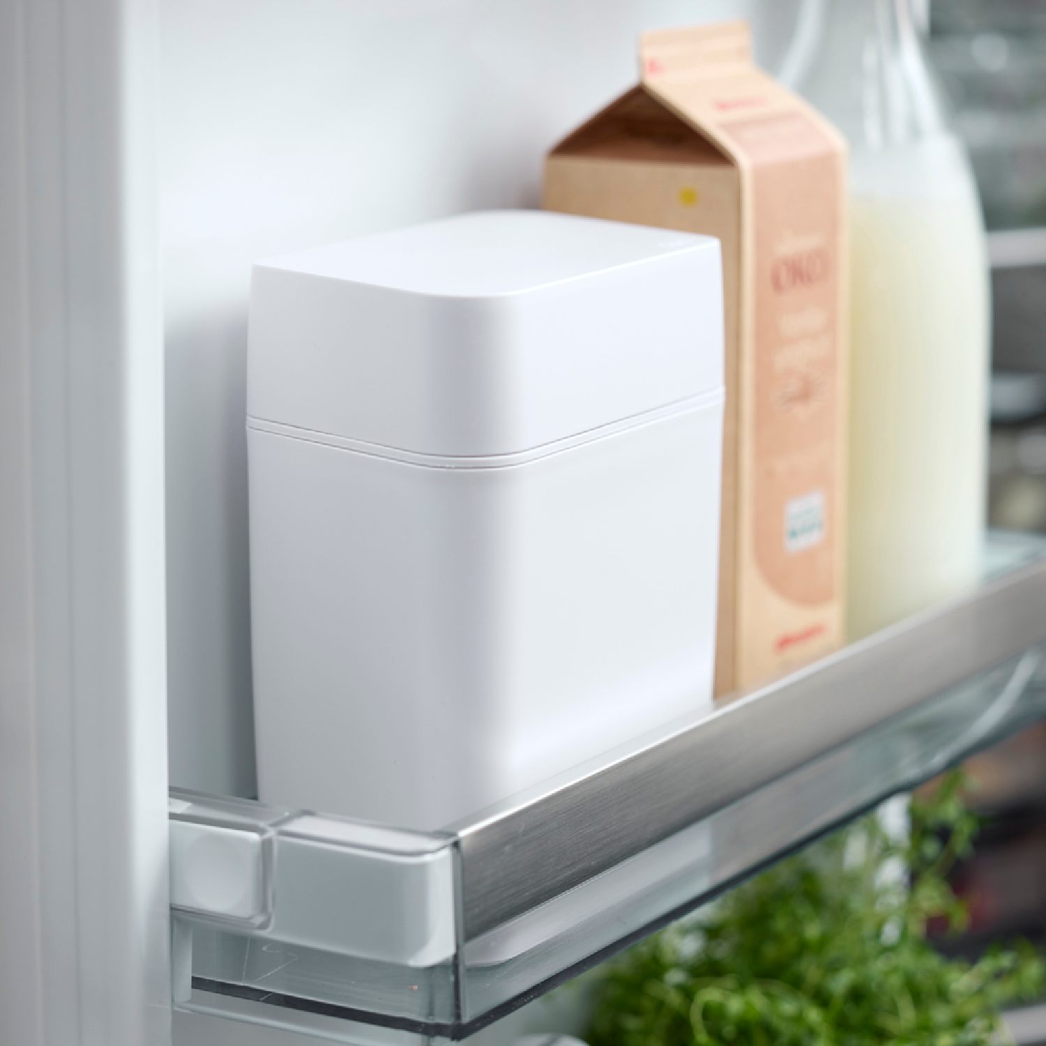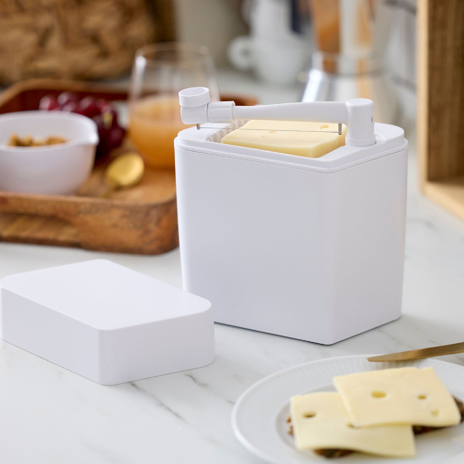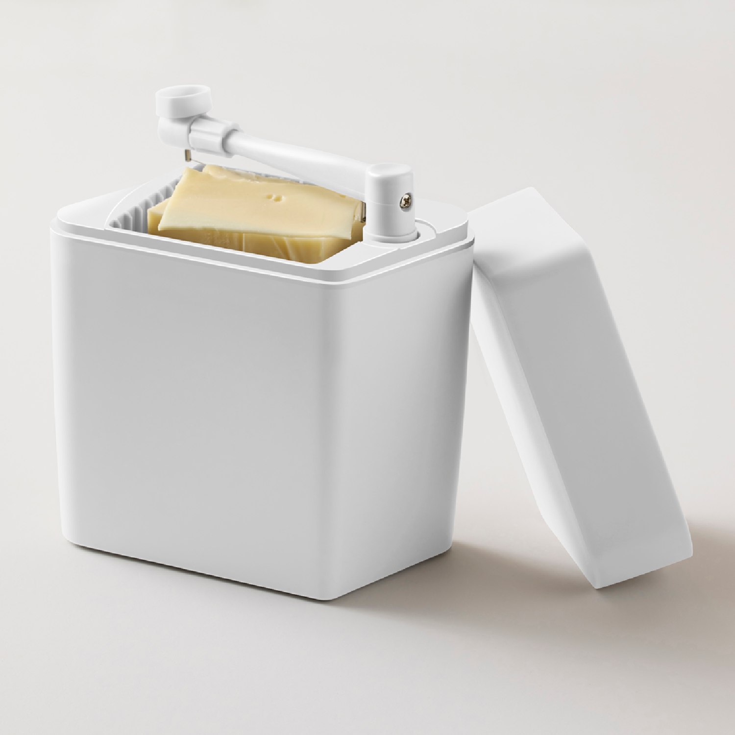 Sandarus dangtelis saugo sūrį nuo išdžiūvimo ir šaldytuvo kvapų; patogu laikyti dėžutę šaldytuvo durelių lentynėlėje kasdieniam naudojimui