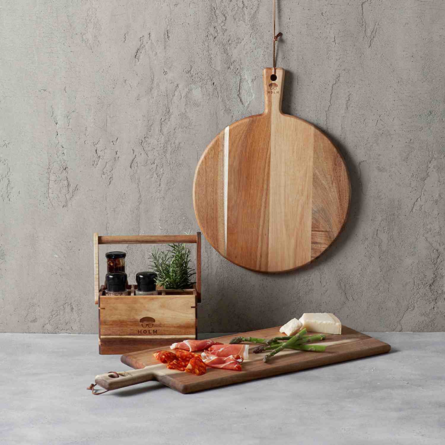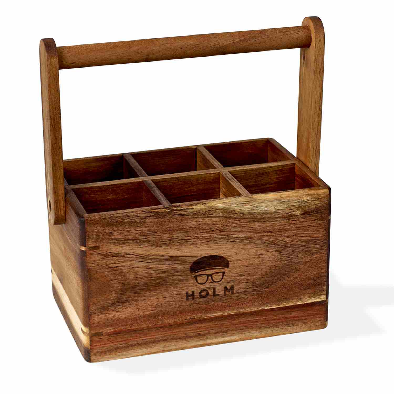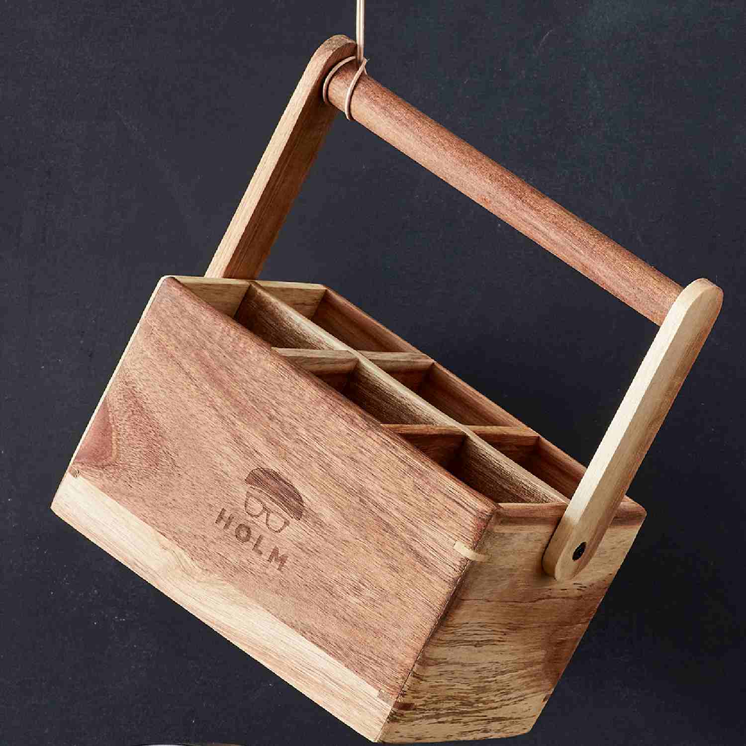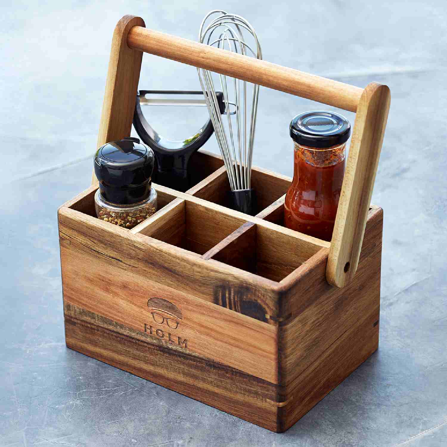 Virtuvės įrankių stovas HOLM – stilingas ir praktiškas sprendimas iš natūralios akacijos medienos, padedantis palaikyti tvarką ant stalviršio.